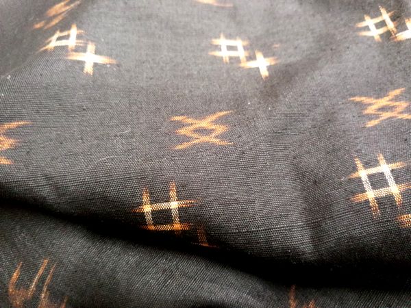 久米島紬は、蚕から取った真綿でつむいだ糸を原料糸として、天然の草木、泥染めによって染色します。織りは、手投杼を用いて丹念に手織りで織り上げます。これらのすべては伝統を踏襲し、一貫した手作業を一人の織子が行うところにあります。