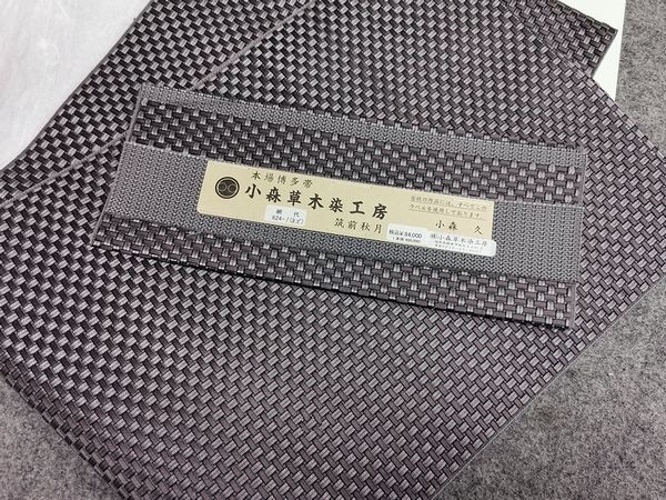 本場博多織の帯は小森草木染工房 小森久の作品。四季折々、刻一刻と表情を変える自然の色に魅了され、「自然を染めたい」と、茜、藍、栗、蓬、梅、葛の葉などの草木を染料に、自然の色を一本一本の糸に再現しております。草木染で染めた博多織帯は、唯一無二(同じ色は二度染められない)ということで、大変人気がございます。お売りいただいたお品は網代の名古屋帯。状態も良く当社の買取強化商品ですので、高額査定となりました。